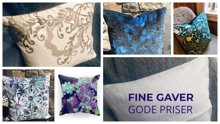 Nederst fra venstre, nummer to: DEICHMANN pute – to små puter i 25X25 i polyester, produsert i England. Nå kun kr. 100,- pr. stk.!